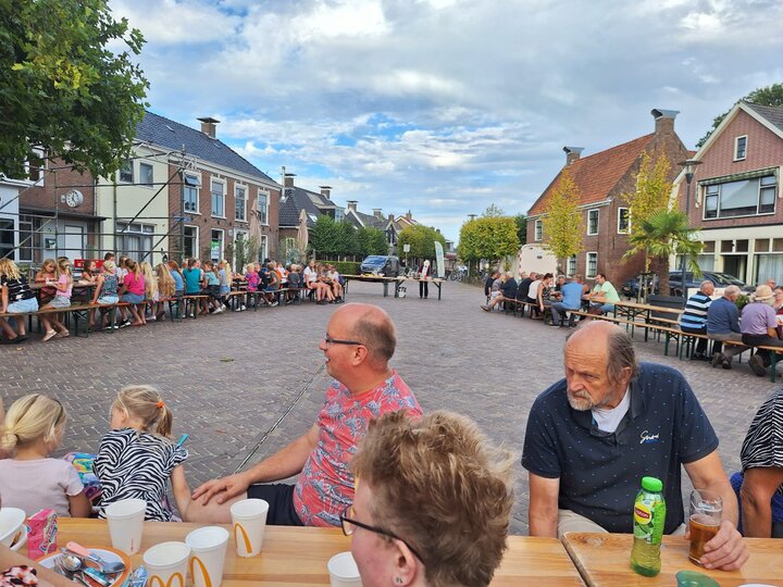 Likernôch 75 folwoeksenen en 50 bern hawwe gebrûk makke fan in unike kâns: oanskowe foar it jûnsiten midden op it Breed oan ien enoarme lange tafel. Sa lang dat er yn trije parten opdield wurde moast.