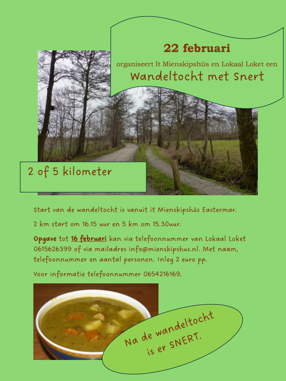 Item: Op zaterdag 22 februari organiseren Lokaal Loket en Mienskipshûs een wandeltocht (2 of 5 km) met SNERT na.